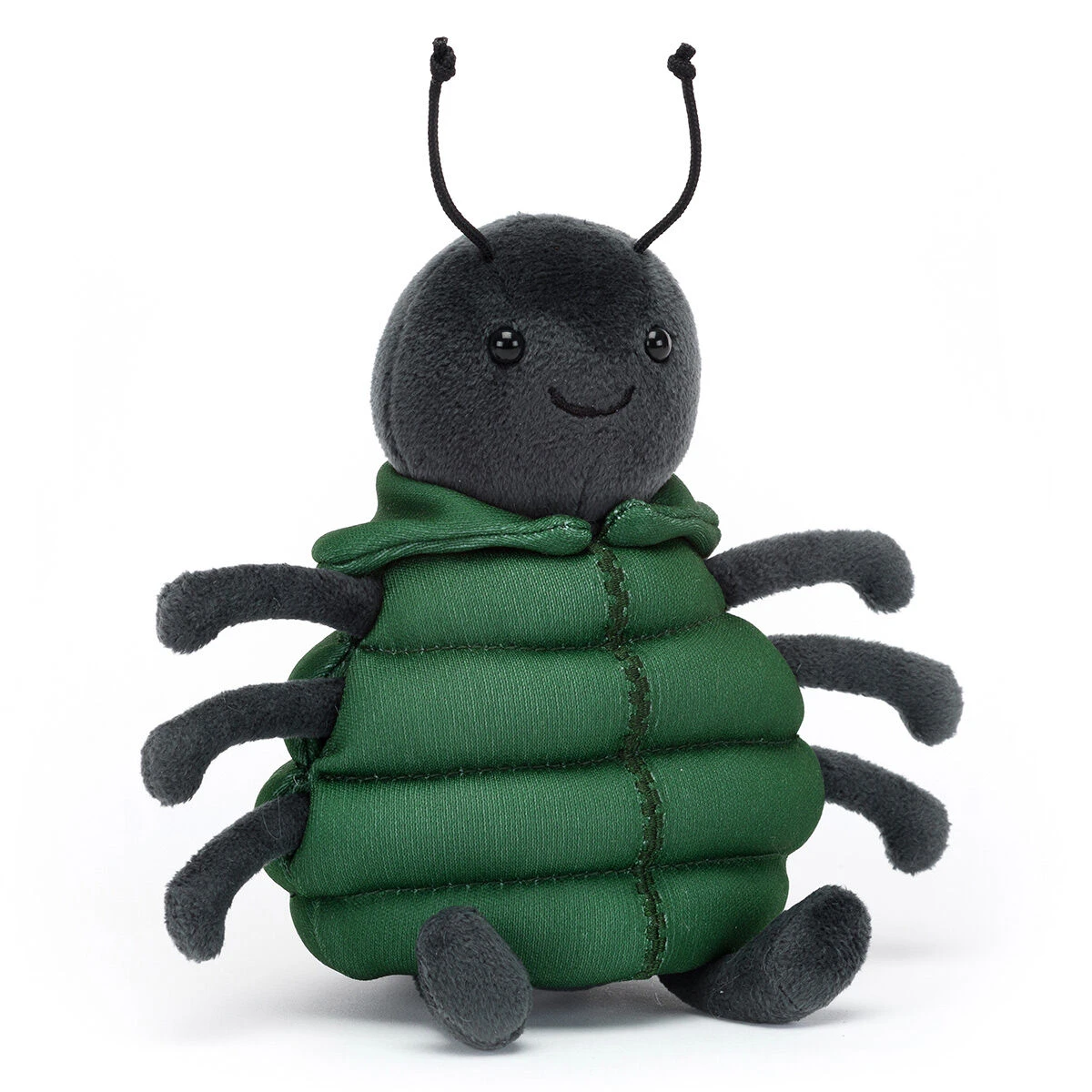 He has soft fluffy black fur, eight tickly legs, a smiling face and green puffy jacket for keeping warm in the cold months! He is perfect for cuddling and snuggling, sure to capture the heart of your little one and become their new favourite playtime companion.