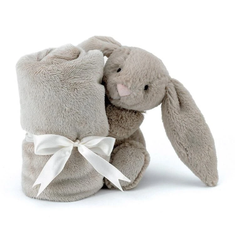 The soother (attached to the bunny’s arms) is made from luxurious super-soft beige fabric and is ideal for providing comfort for your little one. There is a beige ribbon to tie the blanket up when not in use, making it easy to carry around with you. With this cute bunny rabbit’s floppy ears and cute white tail, your child certainly won’t want to leave home without it.