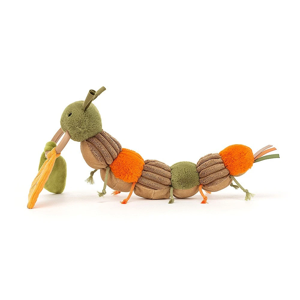 For squiggly garden shenanigans, grab the Christopher Caterpillar Activity Toy! This bobbly bopper has squashy-soft segments in autumn fur and chunky grey cord! Christopher’s rocking ribbony tufts, knotty legs, squeaky leaves and a chunky teether!