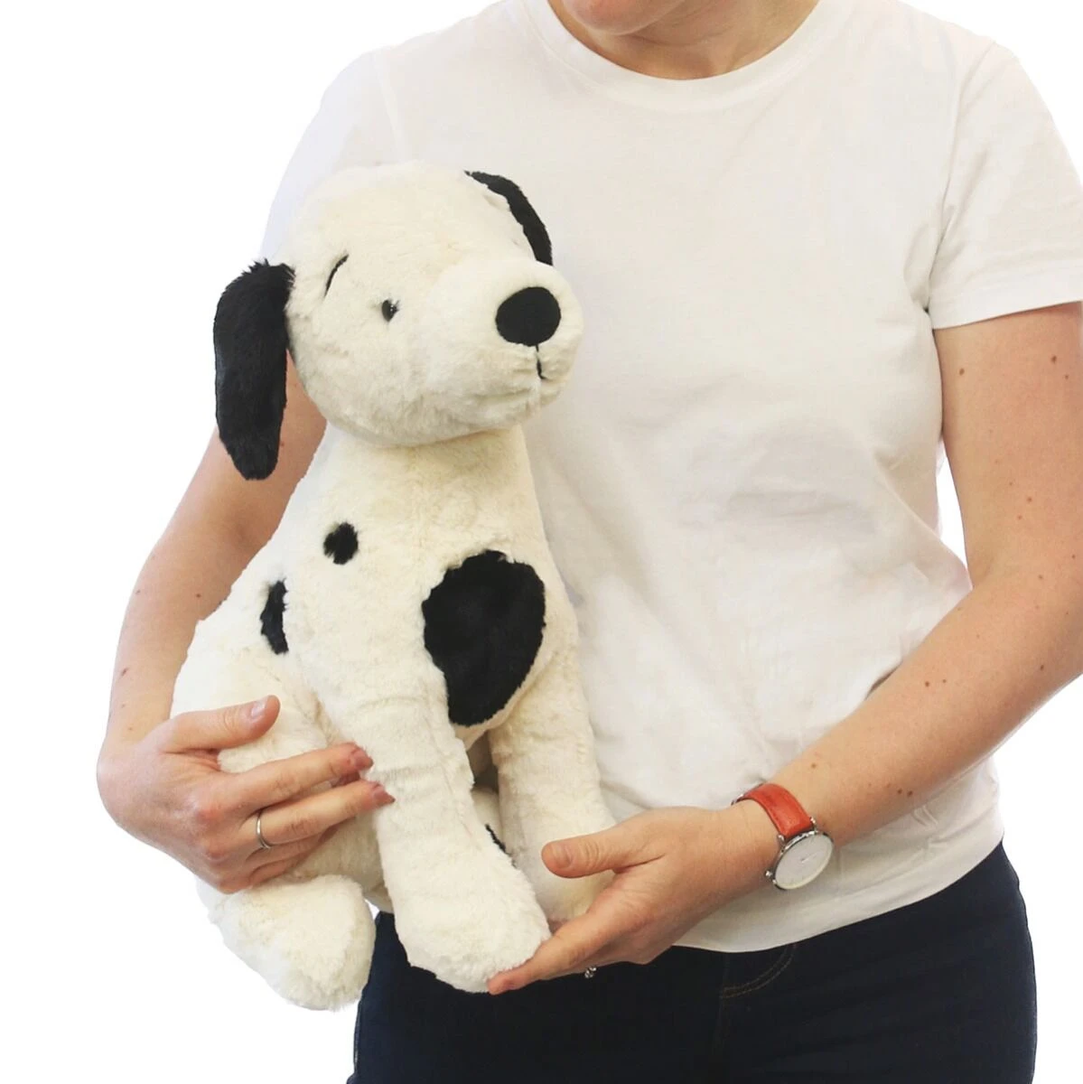 She has irresistibly soft and strokable white fur with black spots, with flopsy black ears, velvety soft paws, and beady black eyes that are full of adorable charm.