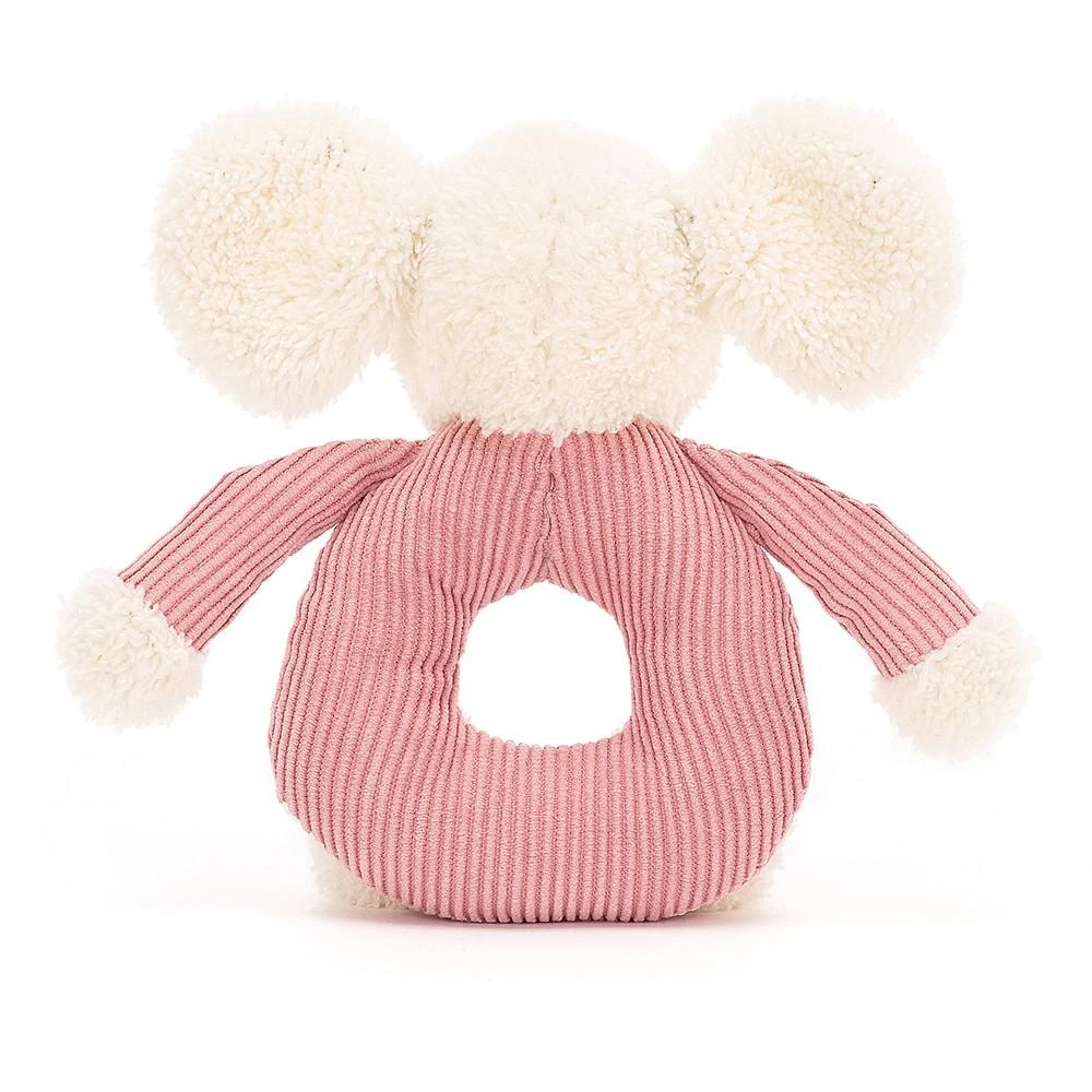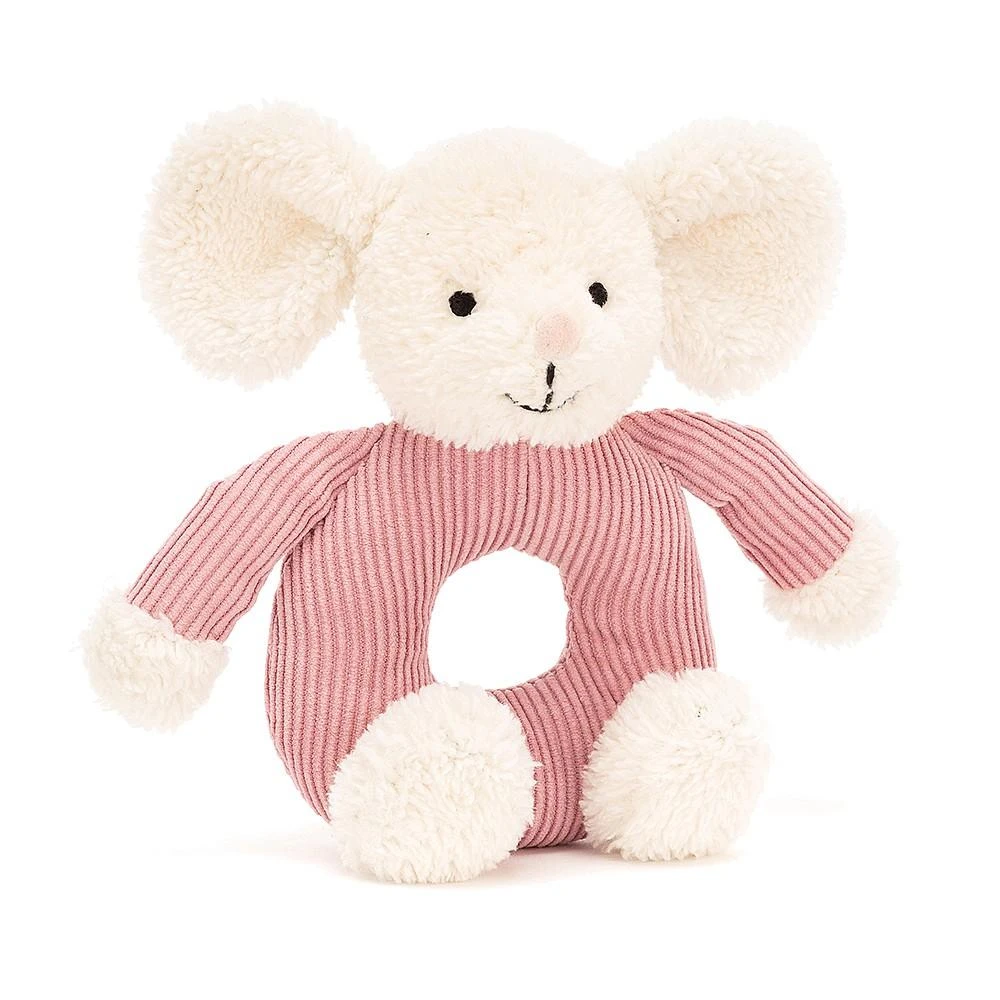 Snuffly-silly, the Jumble Mouse Grabber has scrummy, scruffly creamy fur. With soft foldy ears, a teeny blush nose and a pinky-red cordy romper, this squeaker’s a sweetie! Baby can grab and tumble this mouse to hear gentle rattles all about!