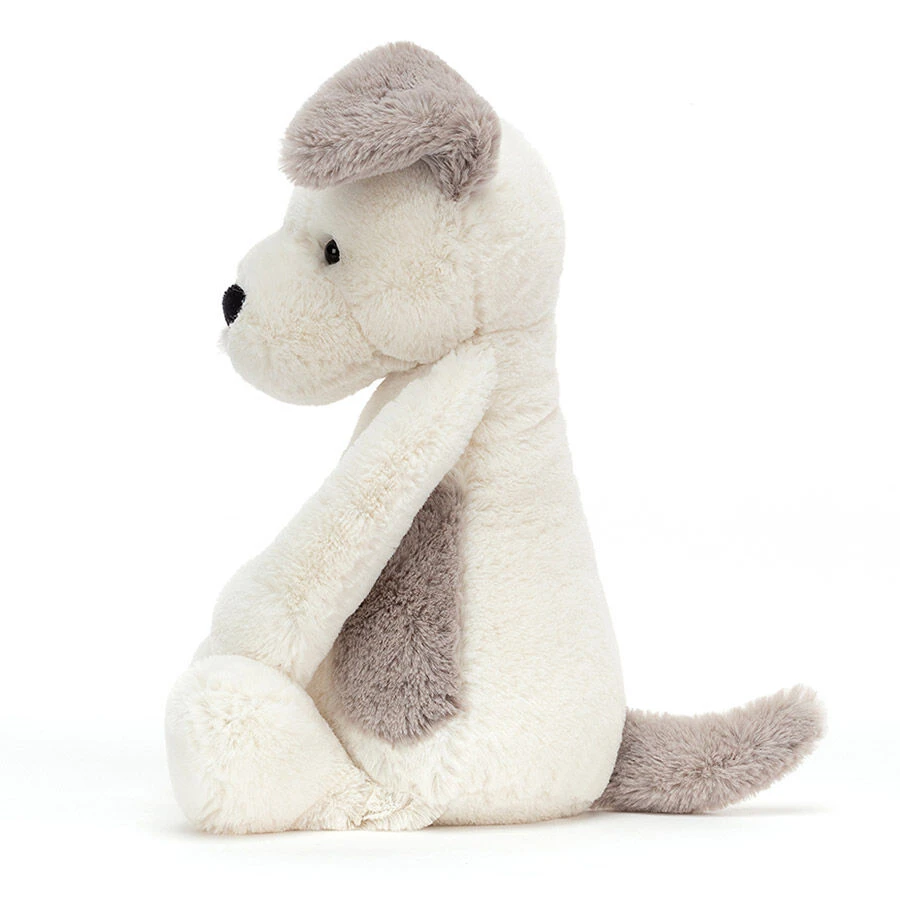 Bashful Terrier has a super soft cream body and tail; he has floppy grey ears and an adorable face with a cute black nose. His soft fur makes him super cuddly, a wonderful companion for taking on an adventure or snuggling up with for nap time.